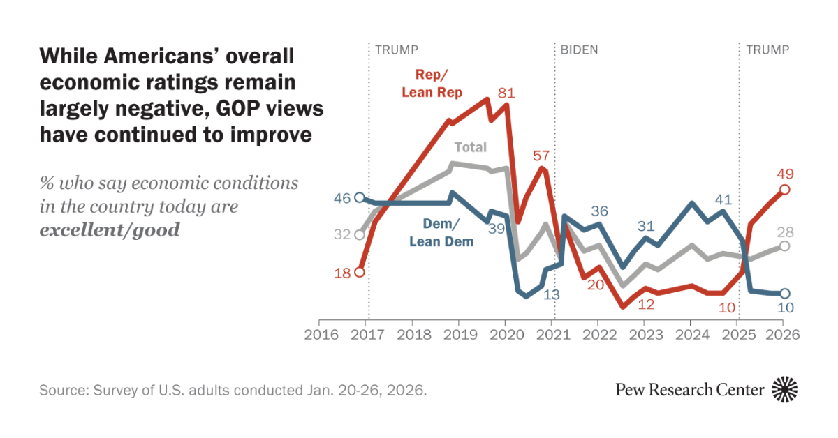A new Pew Research Center survey of 8,512 U.S. adults conducted Jan. 20-26 finds that nearly all of the change in views of the economy since last spring has come among Republicans and Republican-leaning independents: